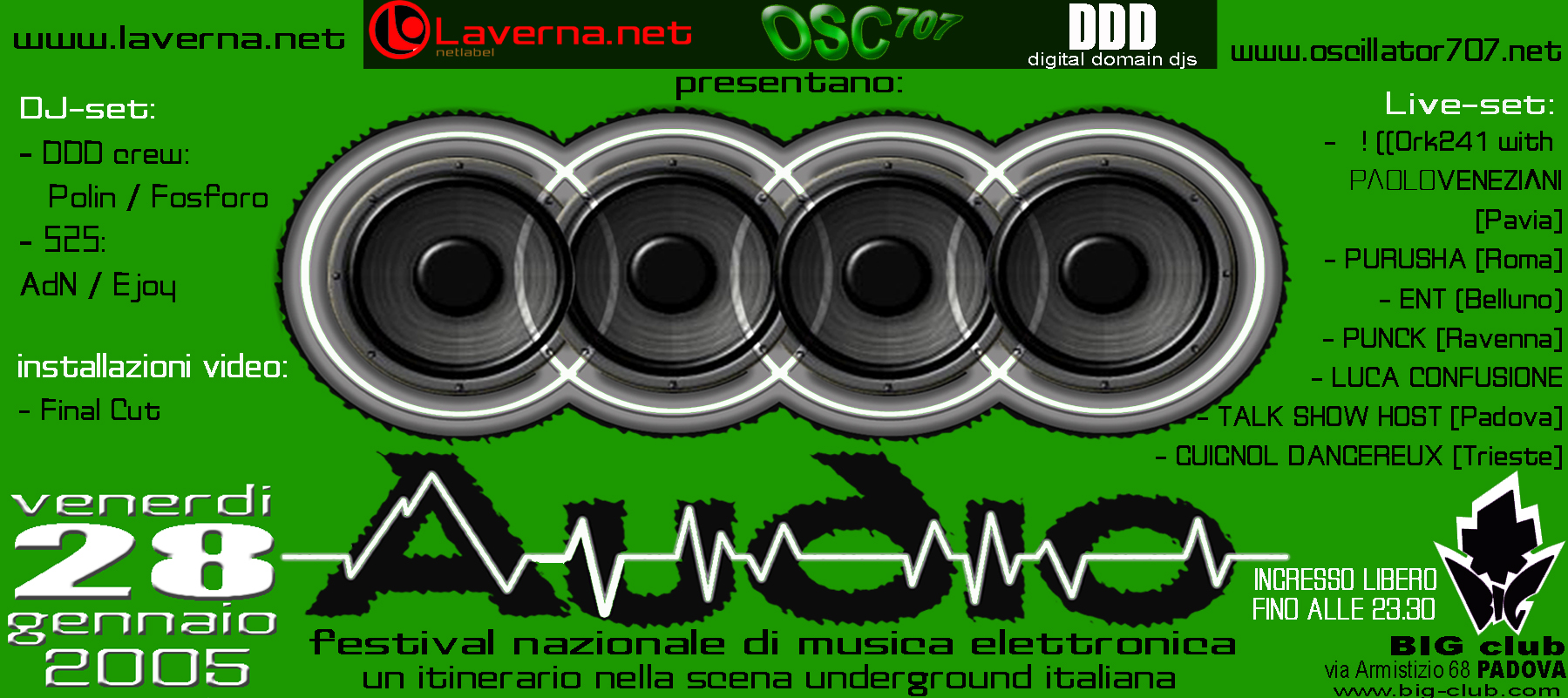 Un evento musicale legato alla scena elettronica nazionale, tra sperimentazione e innovazioni sonore per il dancefloor. Venerdì 28 gennaio 2005, 8 LIVE-SET con un gruppo di musicisti provenienti da tutta Italia che si raccoglie all’interno di un forum molto attivo e partecipato (ocillator707.net), tra essi: Purusha fondatore della storica netlabel OGREDUNG (Roma), !((Ork241 + Paolo Veneziani (Milano), ENT (Belluno), Talk Show Host(Padova), Punck (Ravenna), Luca Confusione, Guignol Dangereux (Trieste), che si raccoglieranno intorno ad un set/cumulo di apparecchiature e groviglio di cavi distribuite in due sale del locale allestite in occasione di questo evento. In un’altra zona, nello stesso tempo, prendono vita 4 DJ-SET tra tech house e d’n’b by D.D.D. Crew (Polin + Fosforo) e S2S (AdN + Enjoy). In entrambi gli spazi video installazioni curate da Cut Up e dai video-artisti dei gruppi che si esibiranno dal vivo.